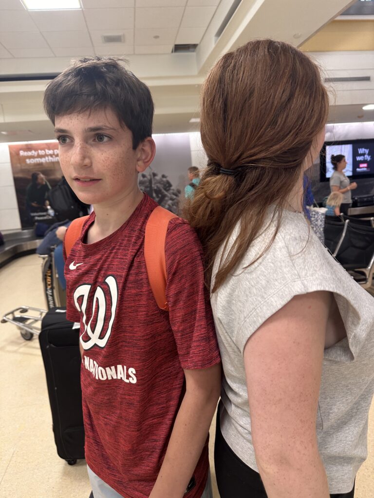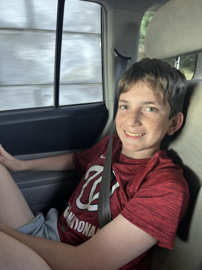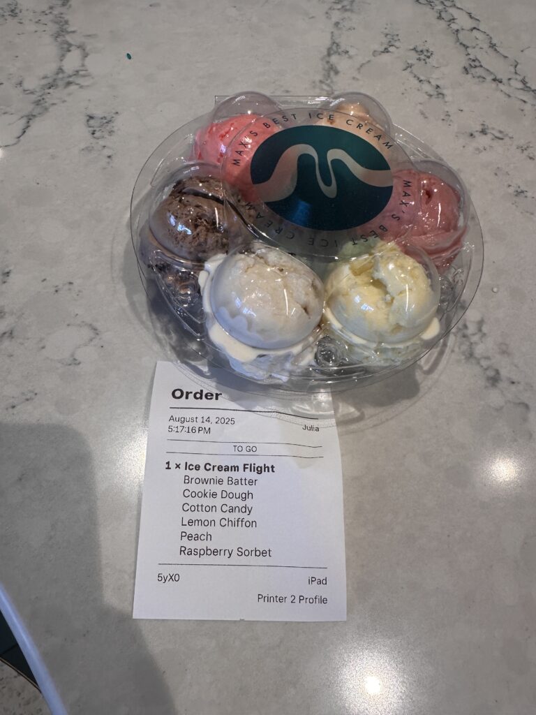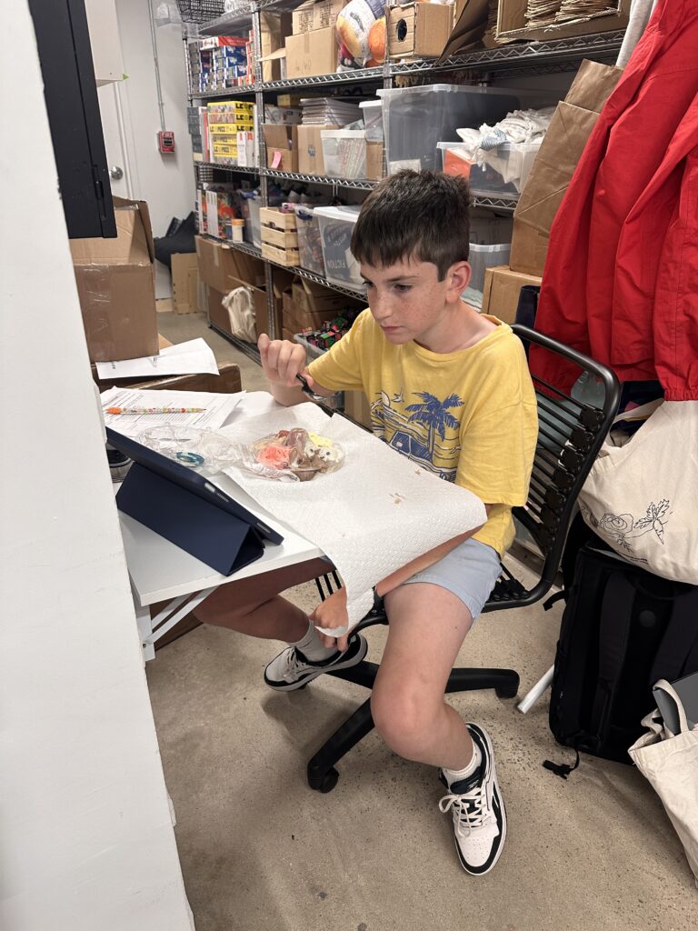 N arrived home from camp on Monday night. We were so excited to see him! He was hoarse, seems taller and skinnier than before he left, and seemed a bit dazed and confused from the sudden transition from camp. He seems better now. He has been relaxing at home, hanging with Nana, seeing Grandma Sandy and Grampy, sleeping late and getting reacquainted with his iPad. Today he came to the store for a bit and sampled the new ice cream place (he got a “flight” of 6 mini scoops) and the new bakery that sells mochi donuts, and then did some geometry review in the back of the store. He has a lot to do before school starts.