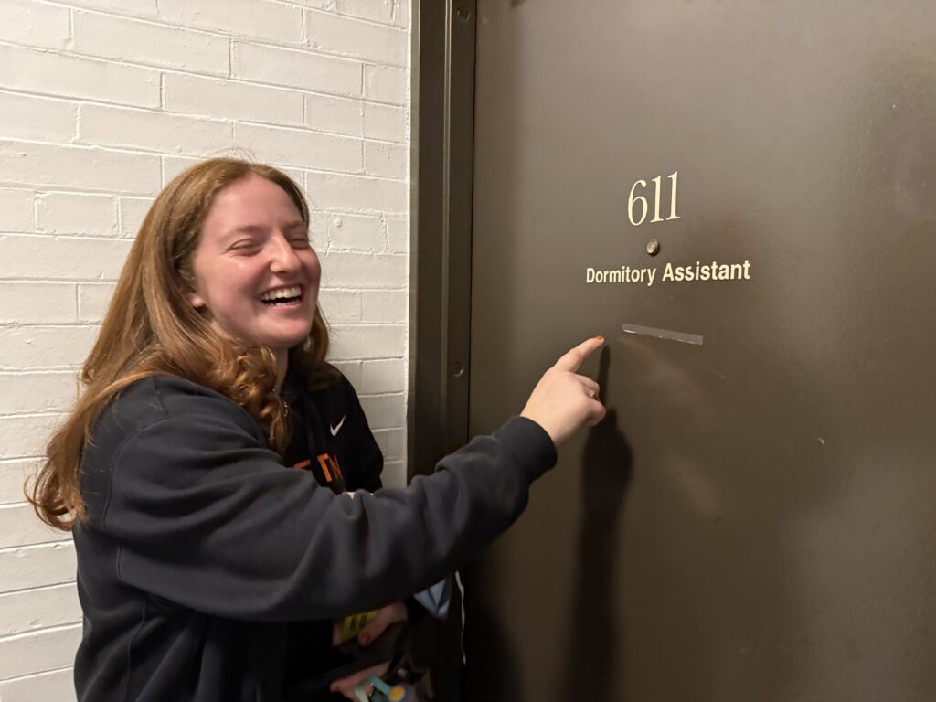 This is the door to M’s room. She is a DORMITORY ASSISTANT.